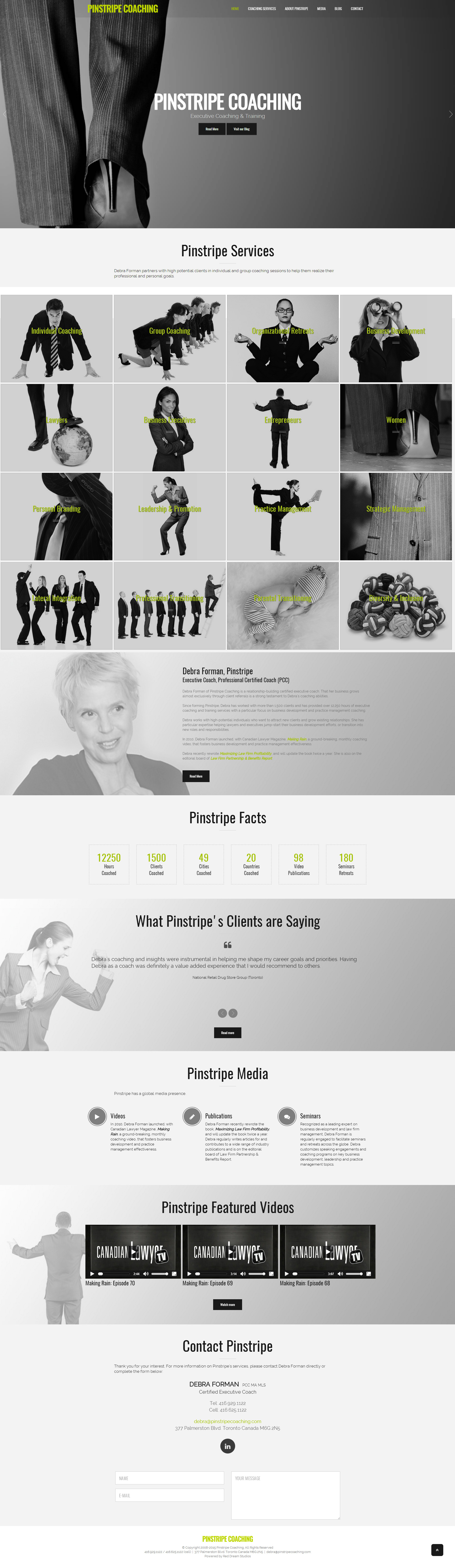 Un client sinec 2008, Debra Forman de Pinstripe Coaching a de nouveau fait appel à Red Dream Studios pour fournir des services de site Web, de graphisme et multimédia. La dernière version du site Web Pinstripe (la troisième refonte depuis le début du partenariat) est basée sur WordPress et illustre bien le large éventail d’offres de services de Debra. Il propose également des blogs vidéo mensuels édités par Red Dream Studios.