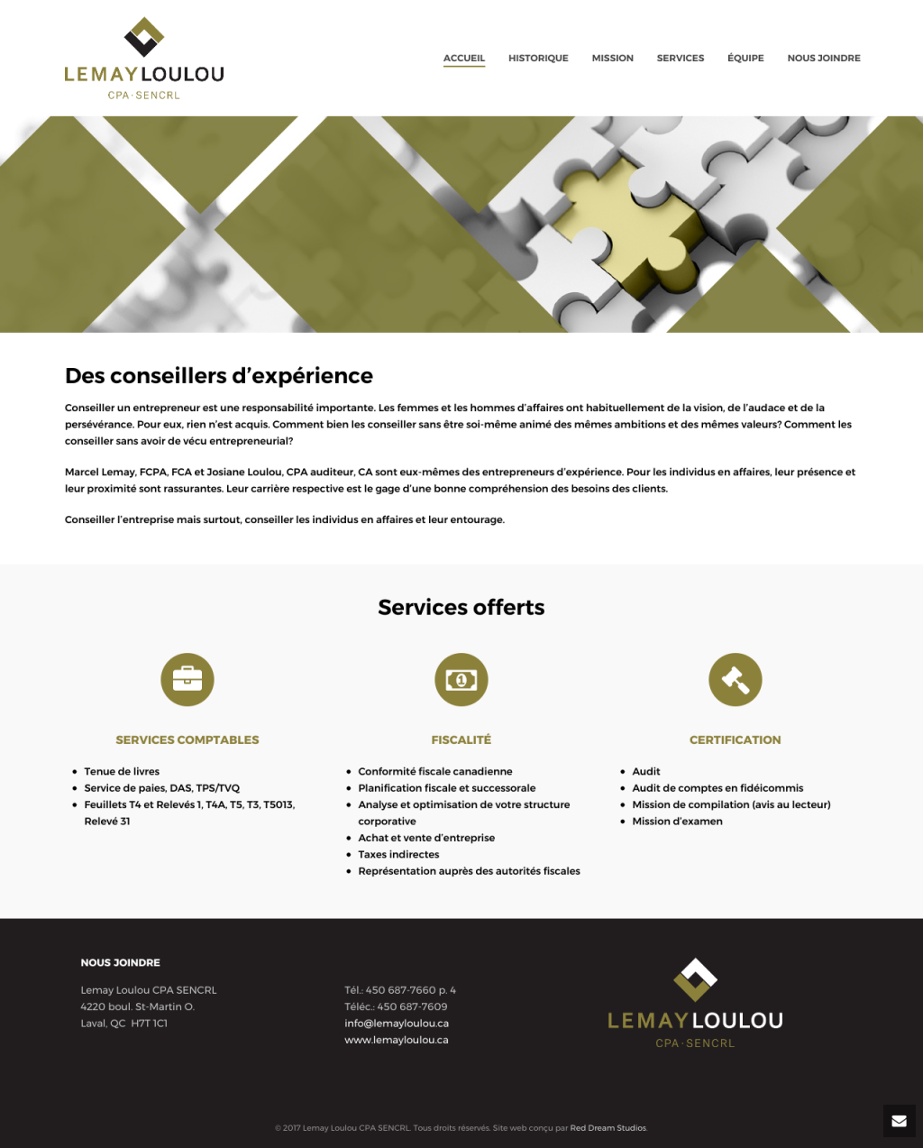 Lorsque le cabinet Josiane Loulou a fusionné avec Marcel Lemay, un comptable en fiscalité fort de plus de 30 ans d’expérience, ils ont décidé d’unir leurs pratiques en fondant le cabinet Lemay Loulou CPA LLP. Ils ont fait appel à Red Dream Studios pour développer un site Web présentant leurs services.